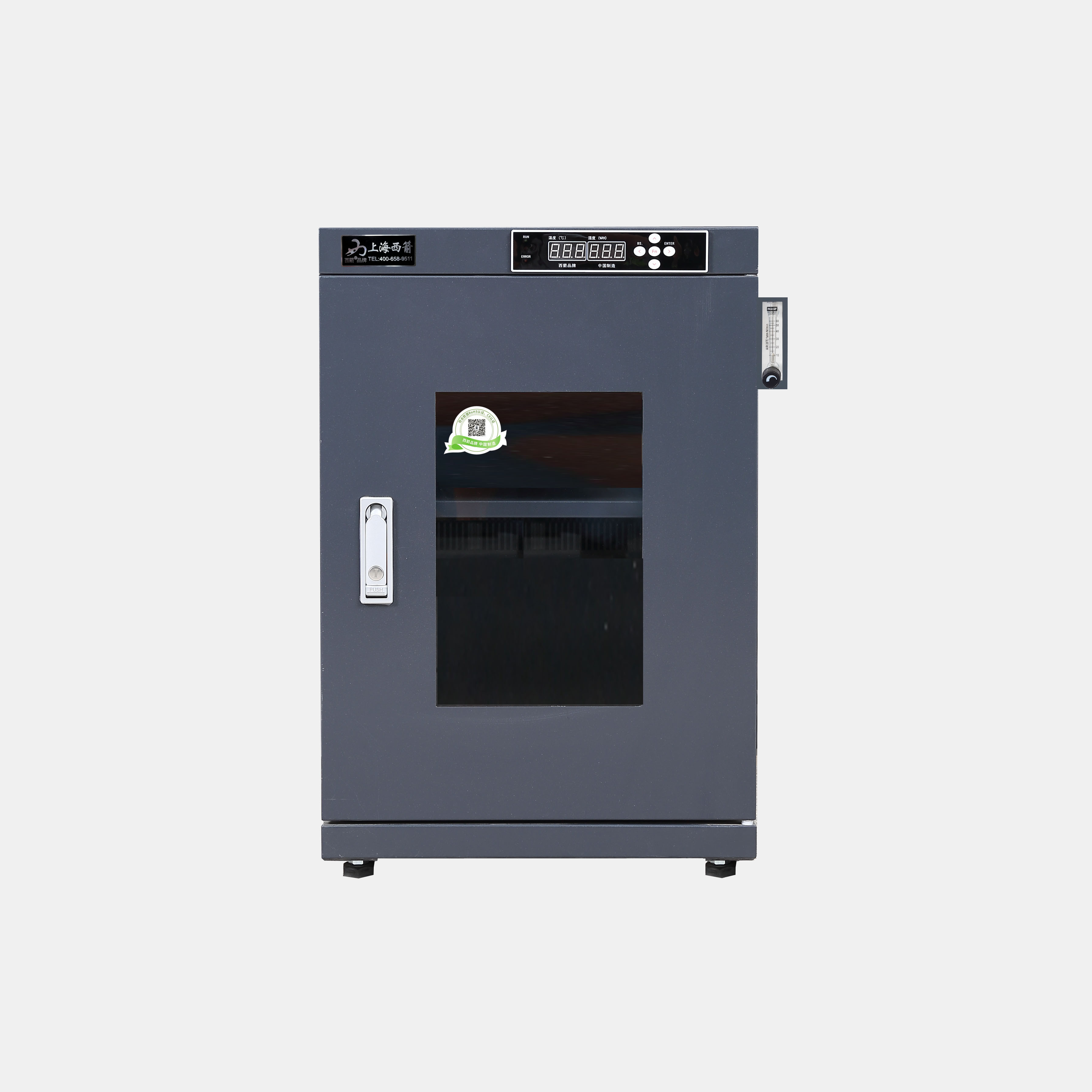 10.配置水晶防爆流量計,電磁閥為日本SMC品牌,濕度1~60%RH可設定,濕度到達設定值時,系統自動切斷氮氣,反之自動打開氮氣并采用氮氣分流設計,確保箱內氮氣分布均勻。